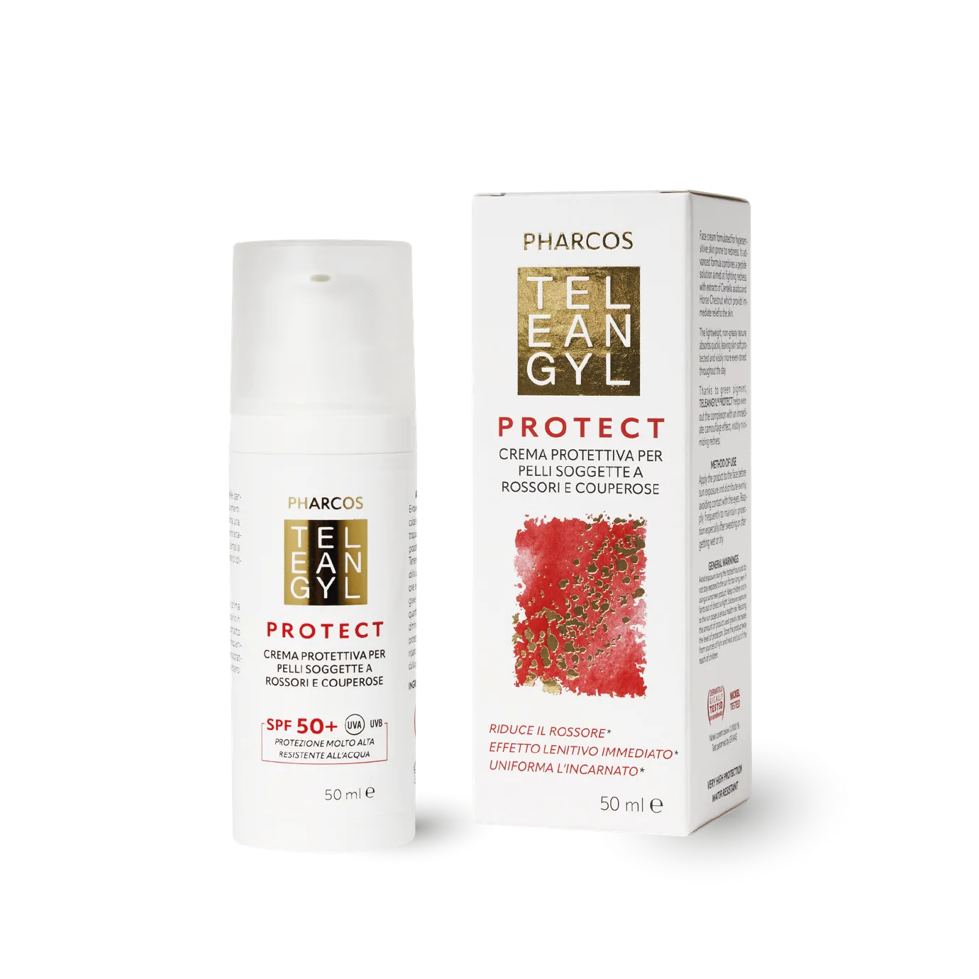Face cream formulated for hypersensitive skin prone to redness. Its advanced formula combines a peptide solution aimed at ghting redness with extracts of Centella asiatica and Horse Chestnut which provide immediate relief to the skin. The lightweight, non-greasy texture absorbs quickly, leaving skin soft, protected and visibly more even-toned throughout the day. Thanks to green pigment, TELEANGYL® PROTECT helps even out the complexion with an immediate camou age effect, visibly minimizing redness. Dermatologically tested on sensitive skin Nickel tested REDUCES REDNESS* - IMMEDIATE SOOTHING EFFECT* - EVENS OUT THE COMPLEXION* *Self-assessment test on 20 volunteers, applied every morning for 28 days; opinion of 95% of participants. -